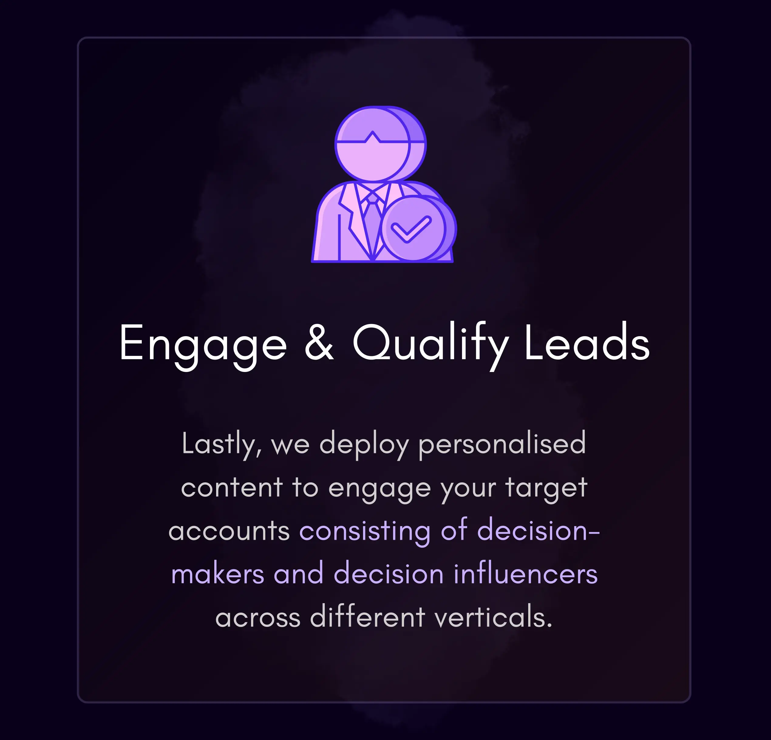 This solution helps you define your company’s true buyer personas, identify and prioritise the accounts that will give you the best return on your investment, create targeted messaging, and execute campaigns that drive sales.