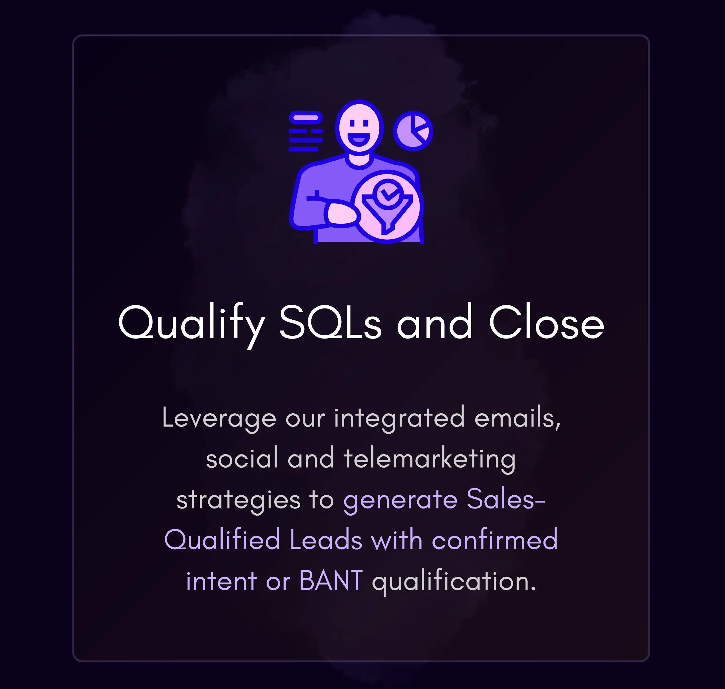 The SQLs you get will have met the Budget, Authority, Need, and Timing criteria, making them sales-ready. We’ll also confirm their current solutions and the challenges they’re facing, so we don’t miss out on any details.